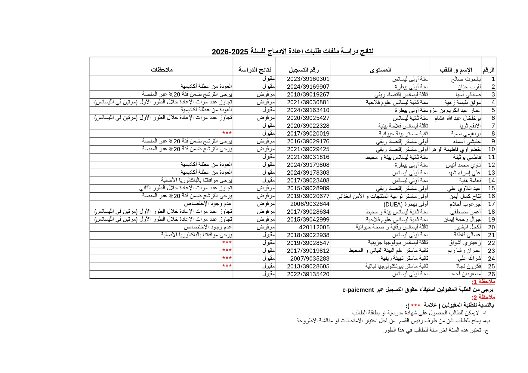 نيابة العمادة لما بعد التدرج- نتائج دراسة ملفات طلبات إعادة الادماج للسنة 2025-2026 5 octobre 2025 0 530 ملاحظة هامة حدد تاريخ 10 أكتوبر 2025 كآخر أجل لعملية التسجيل نتائج دراسة ملفات طلبات إعادة الادماج للسنة 2025-2026