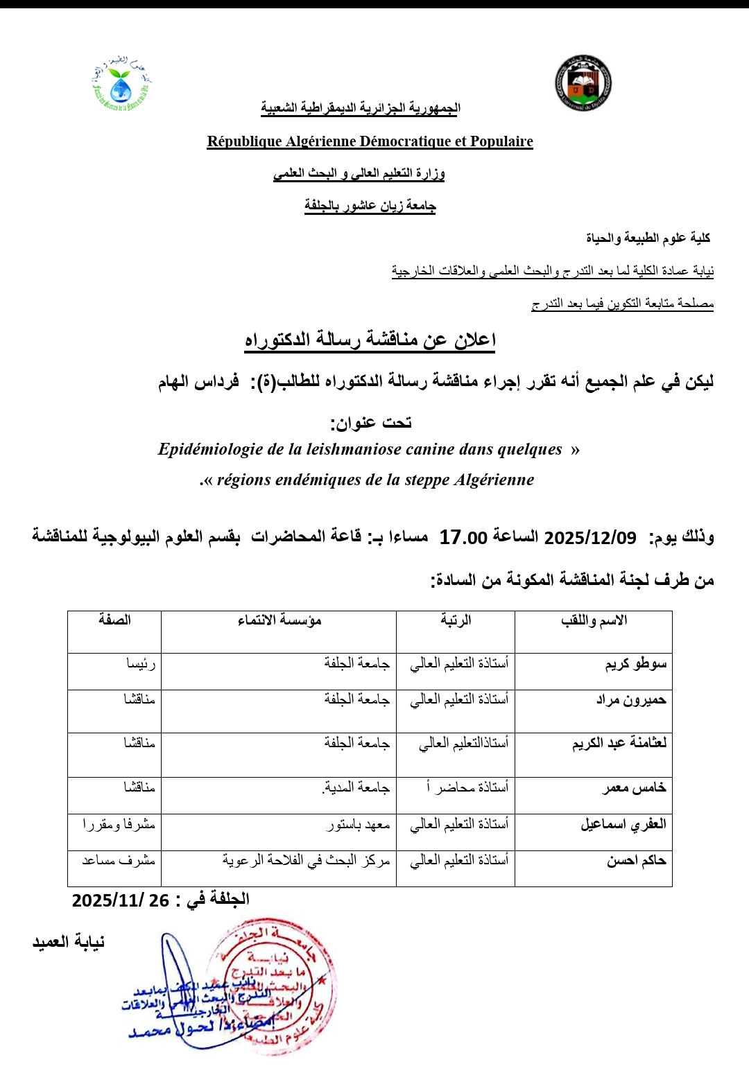 نيابة العمادة لما بعد التدرج- اعلان مناقشة دكتوراه