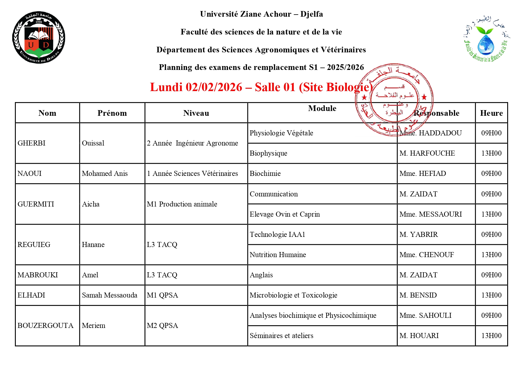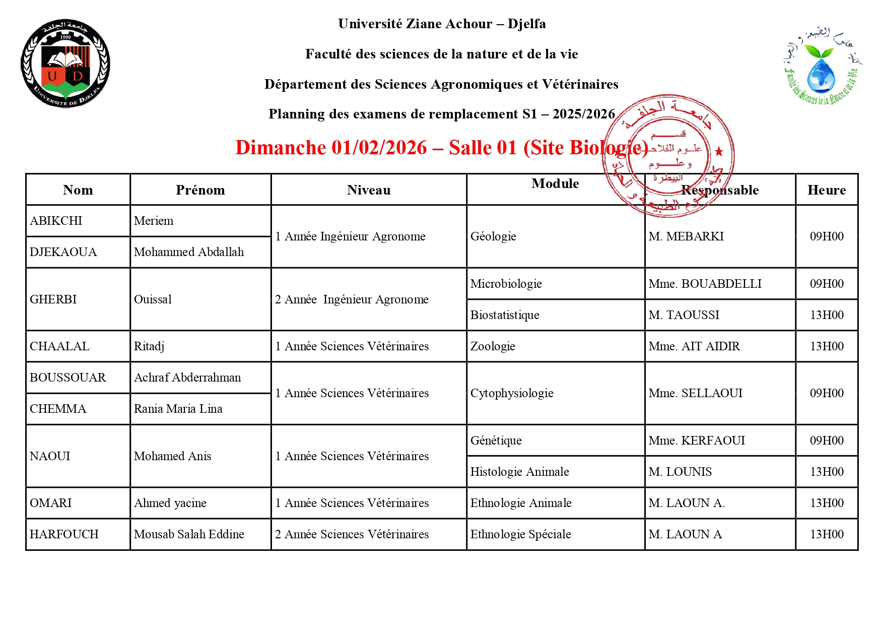 Département des sciences agronomiques et vétérinaires- Planning d’Examens