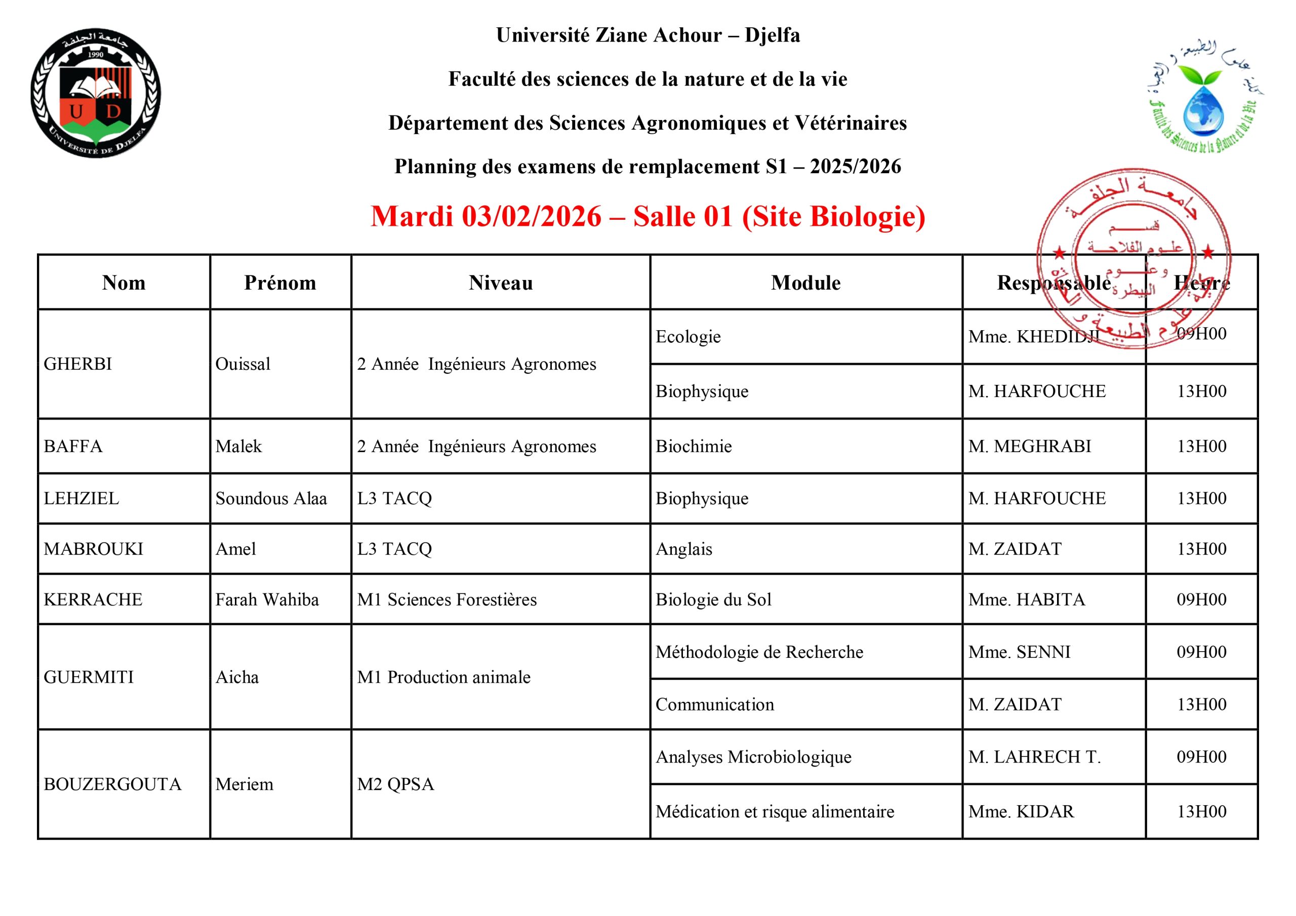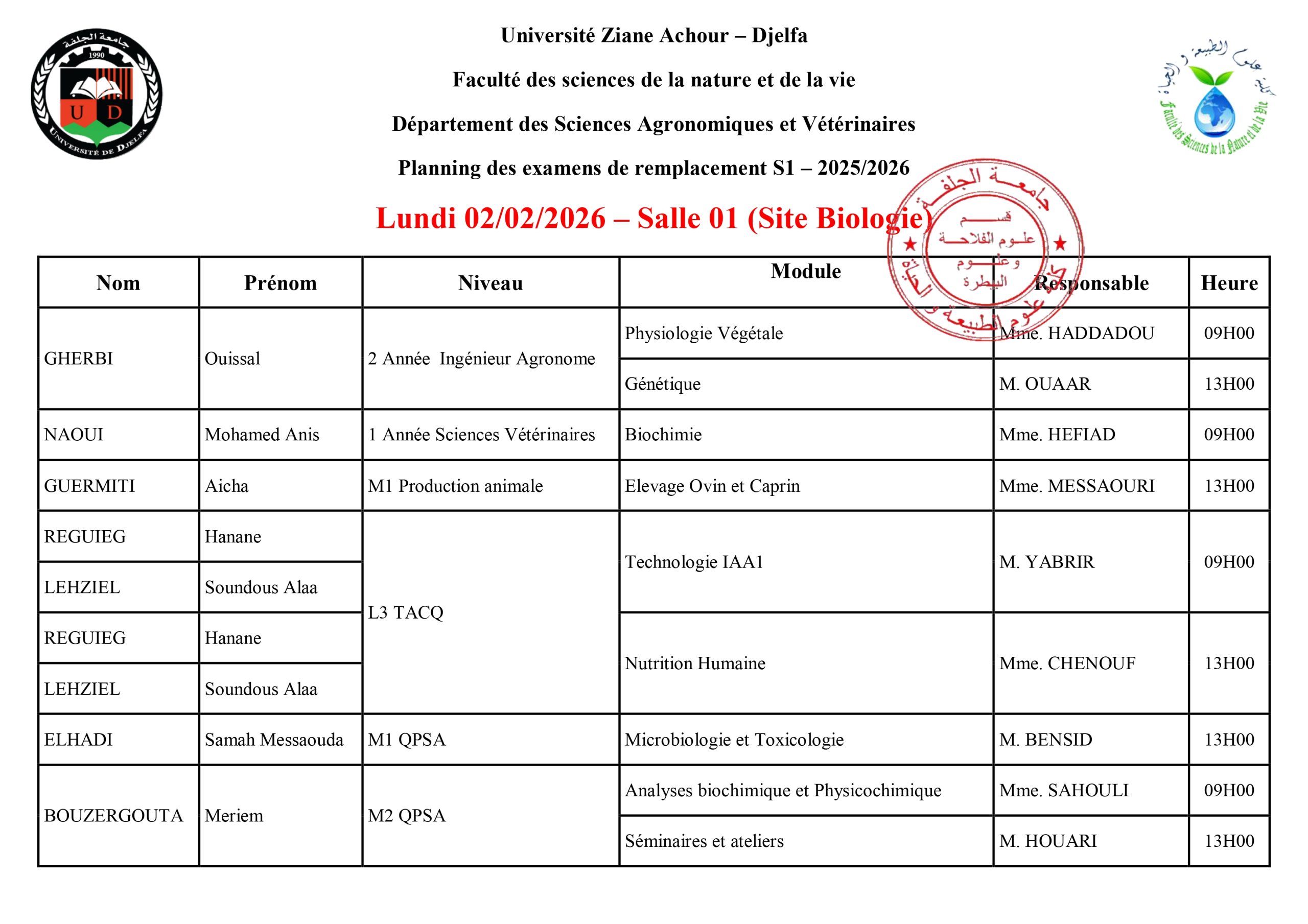 Département Sciences Biologiques- Examens de Remplacement S1 2025-2026