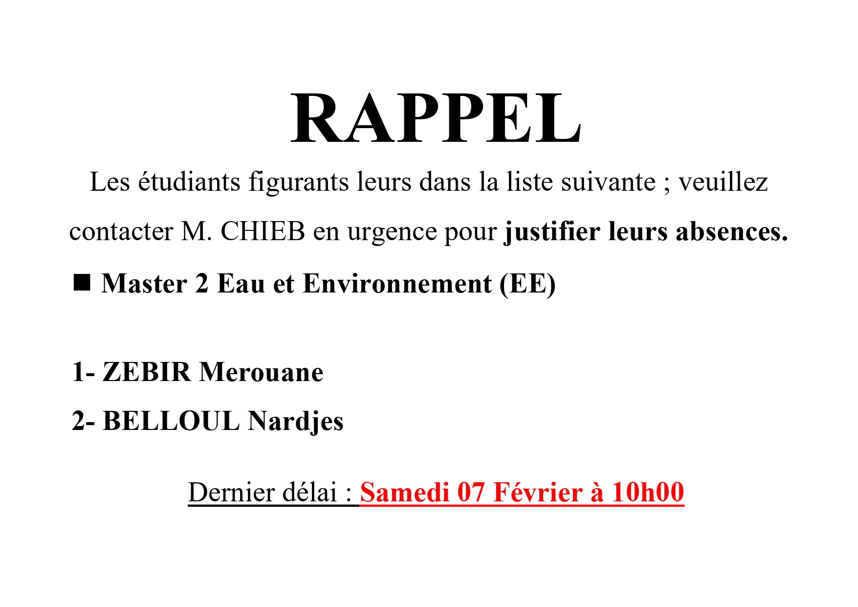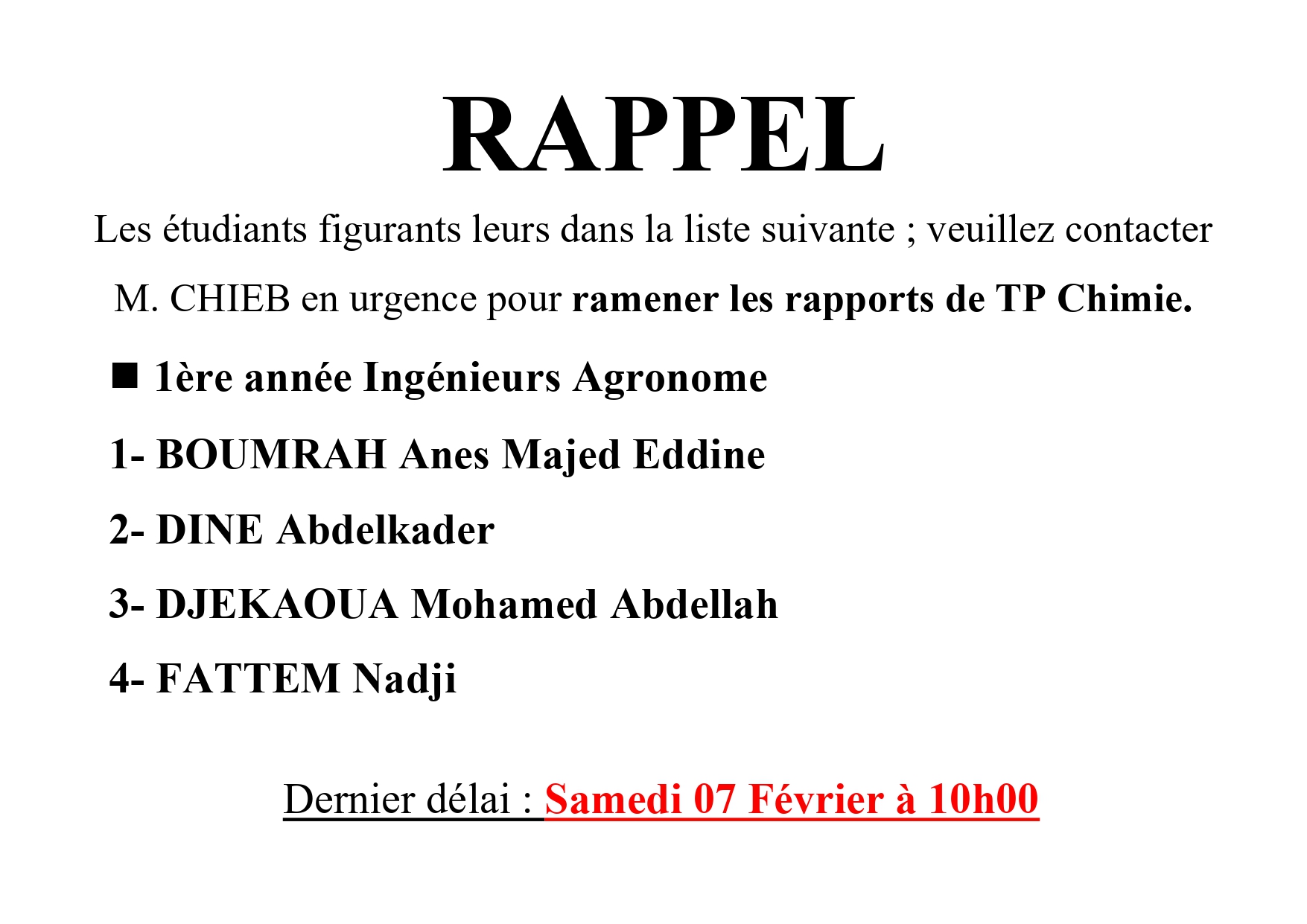 Département Sciences Agronomiques- Note Importante pour les étudiants